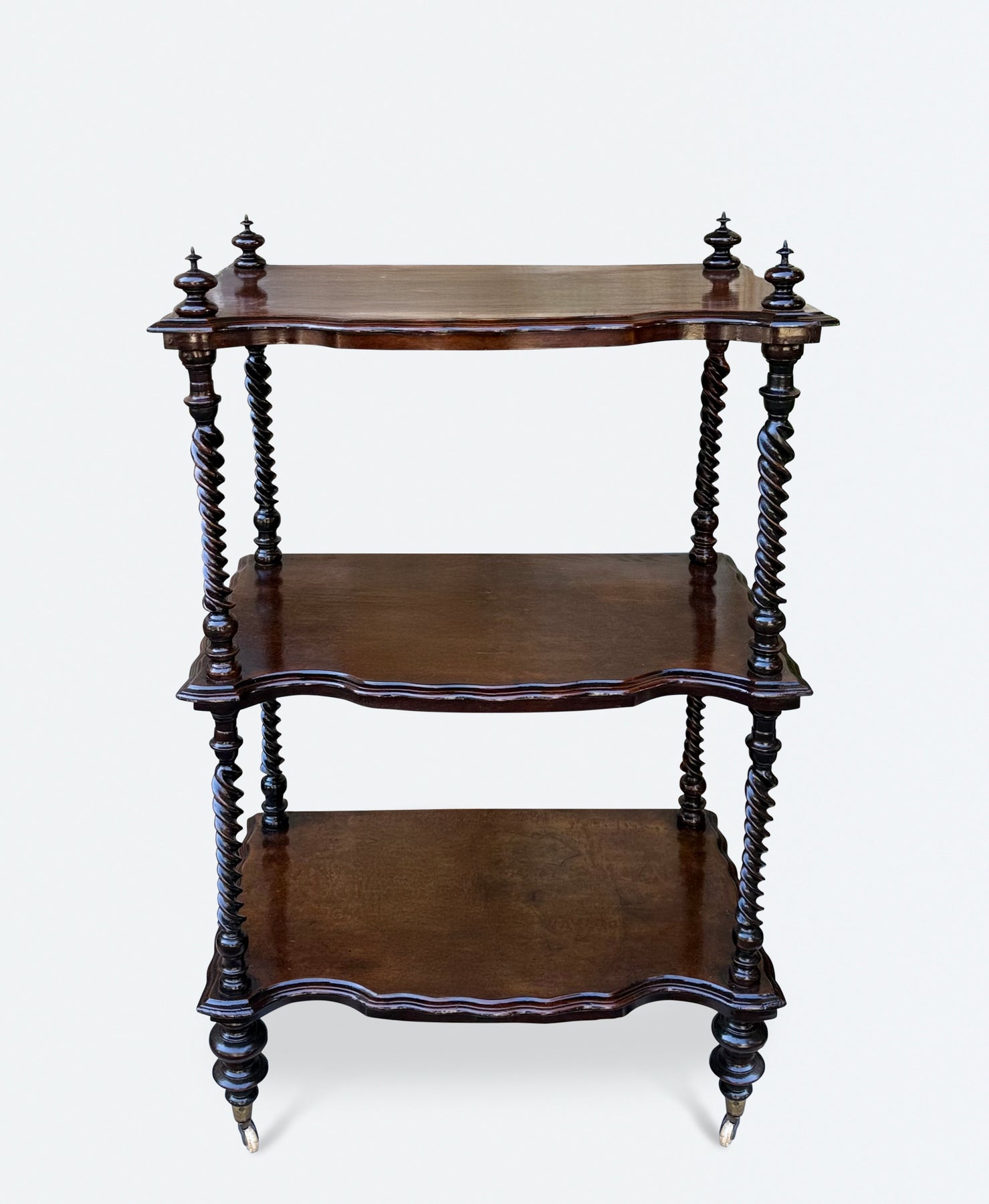 Antique English Burl Wood "What Not Shelf" / Etagere with 3 shelves and on original small Casters.
