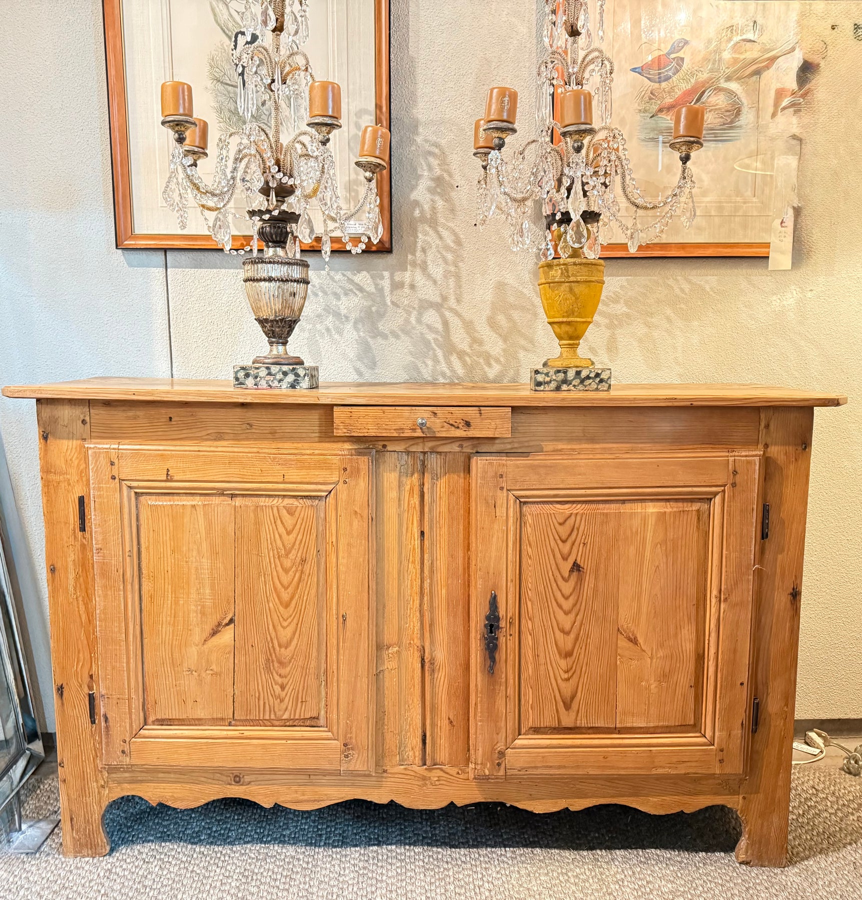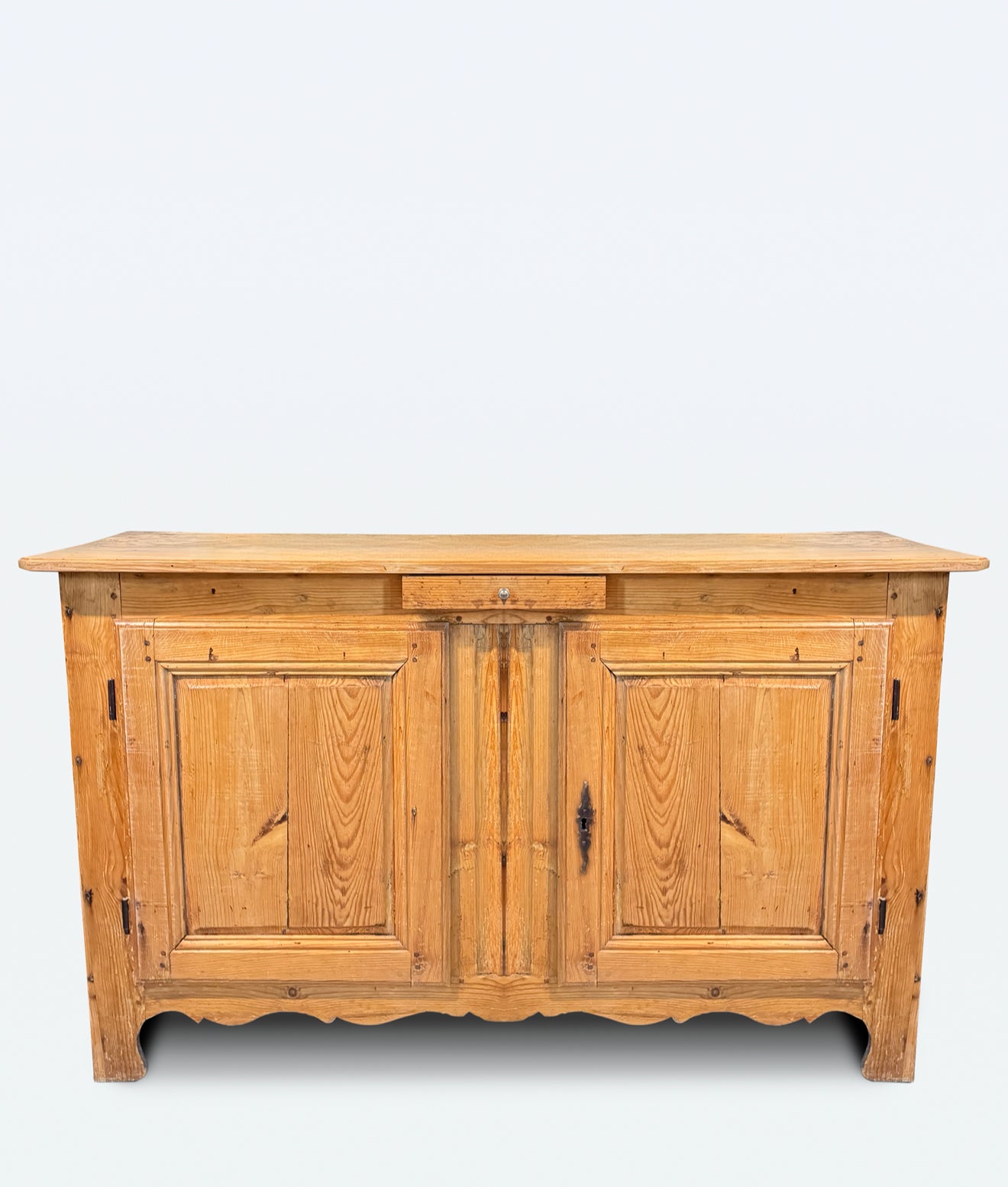 French pine buffet with one drawer over two doors, the doors have recessed panels framed by beveled molding and original steel hardware. The piece has beautiful age and patina.