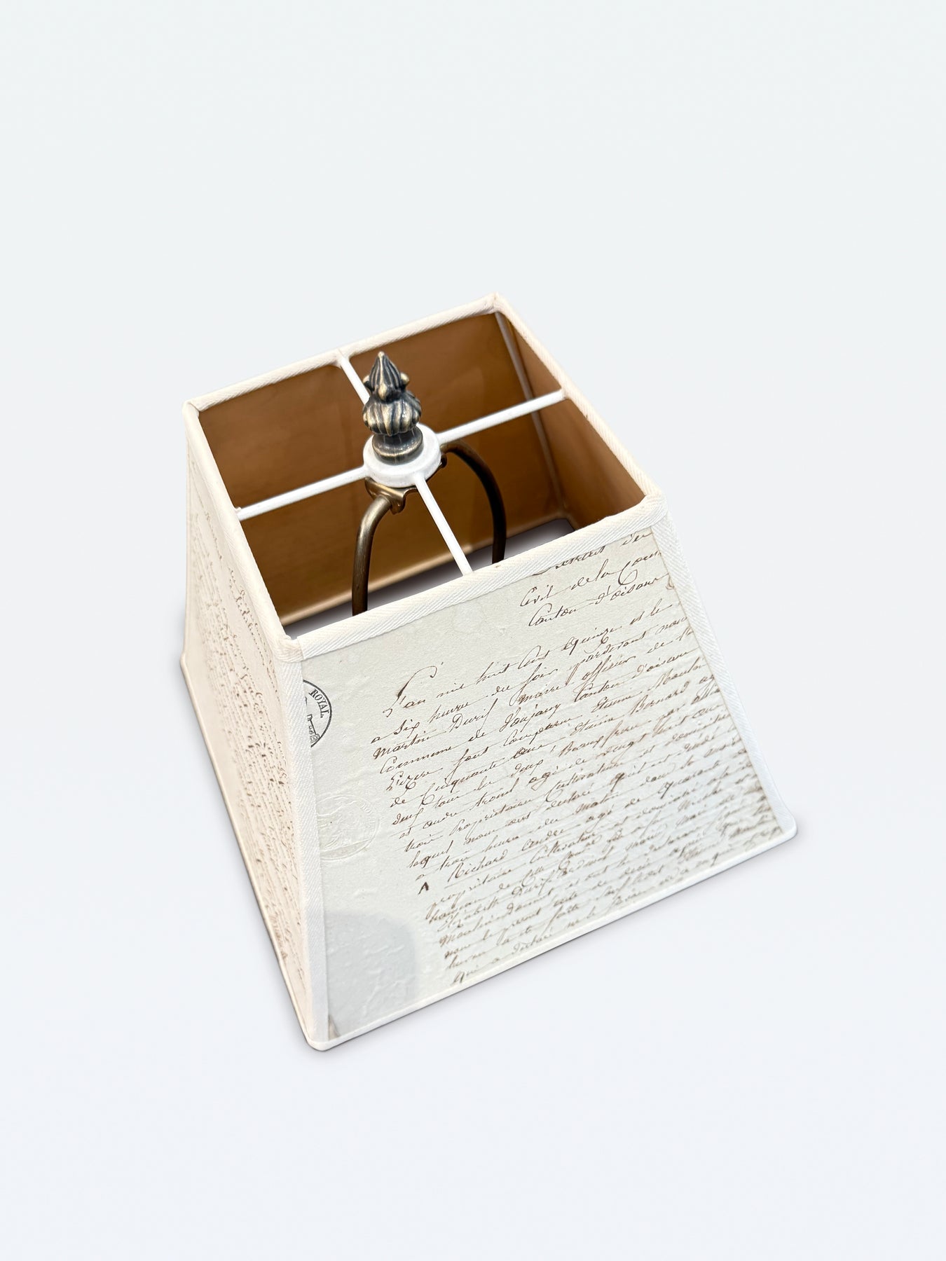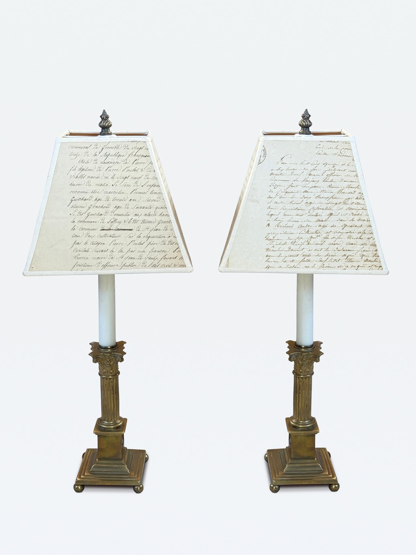 A very handsome pair of antique brass corinthian column table lamps, rewired with silk cords and in excellent condition with french parchment shades made from antique letters.