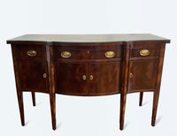 Vintage Rittenhouse Square Sideboard by Henredon. Elegant bow front with handcrafted with dovetail joinery, book matched walnut burl with inset banding and brass ferrules and pulls. Storage includes a lined silverware drawer, two smaller drawers, large storage below
