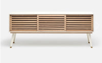 The Delvin console in a faux raffia finish and front-facing bleached oak. Slatted gliding doors give a nod to mid-century design while the buffet's textured material makes it organic and contemporary. Adjustable shelves and cord management cutouts are perfect for stowing media equipment.
