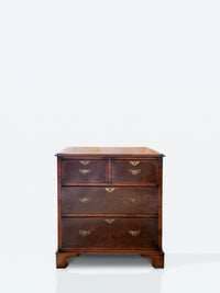 This handsome chest is in walnut veneer with satinwood boarders. The chest of drawers has 2 smaller at the top and 2 larger slightly graduated drawers beneath. The chest has brass swan neck handles and it stands on a bracket feet.