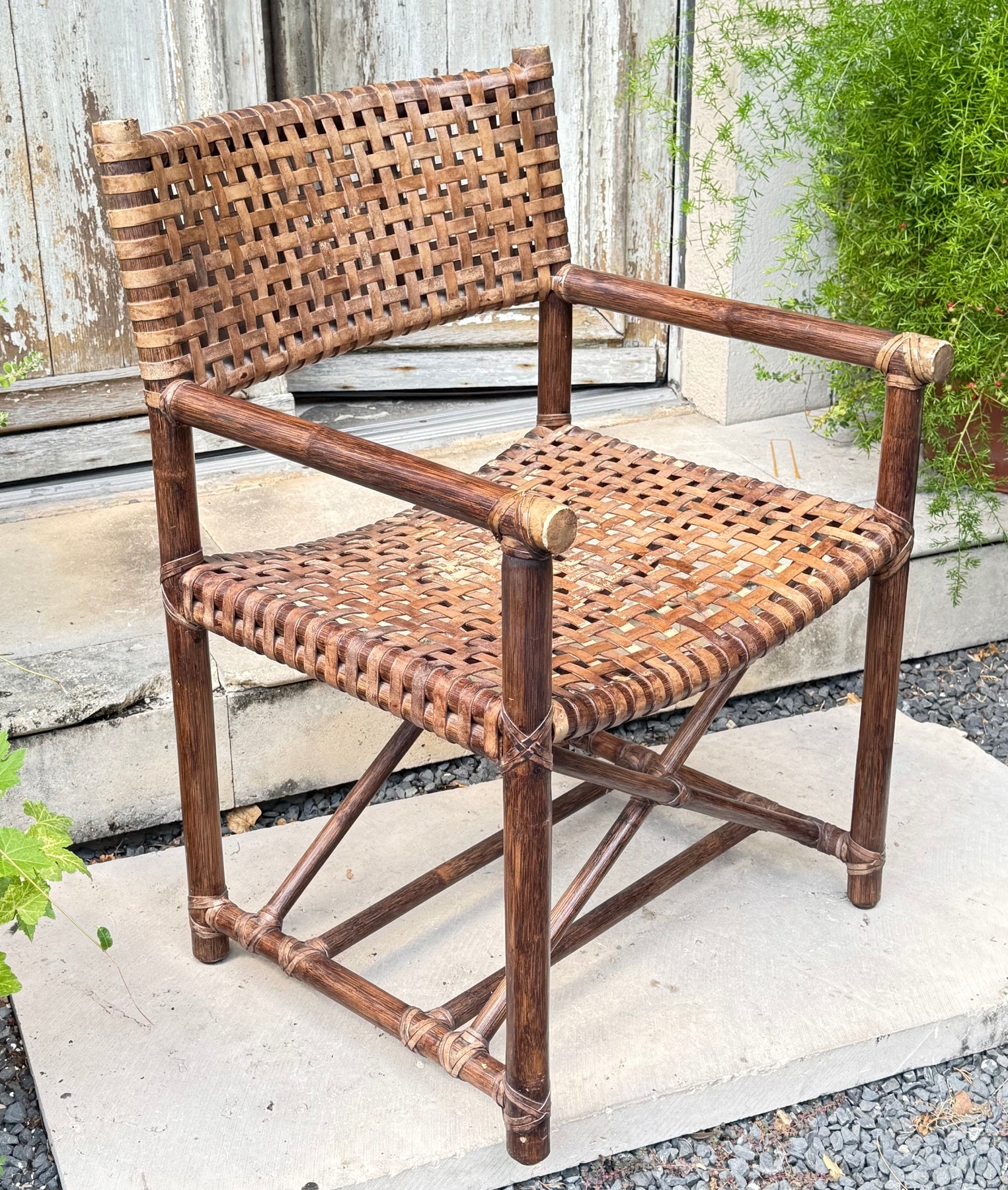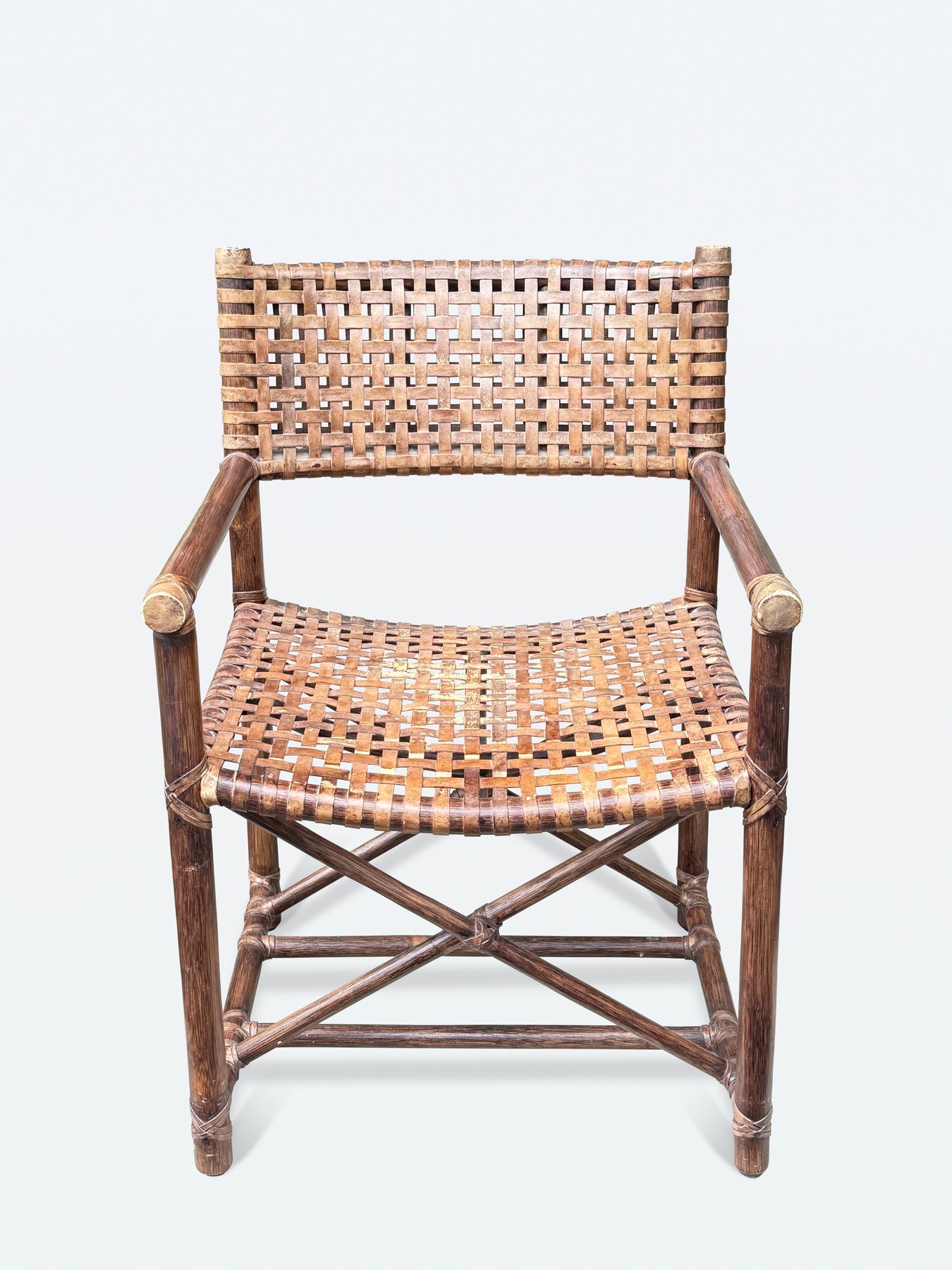 Vintage McGuire Antalya directors style dining armchairs featuring lattice style laced rawhide woven leather seats and back. the chairs are crafted with rattan poles lashed together with leather rawhide laces on the exposed joints and arm ends. The generous seat is supported by straight legs conjoined by x form stretchers in a directors chair style. Made in the California organic modern style with McGuire makers plaque on bottoms.