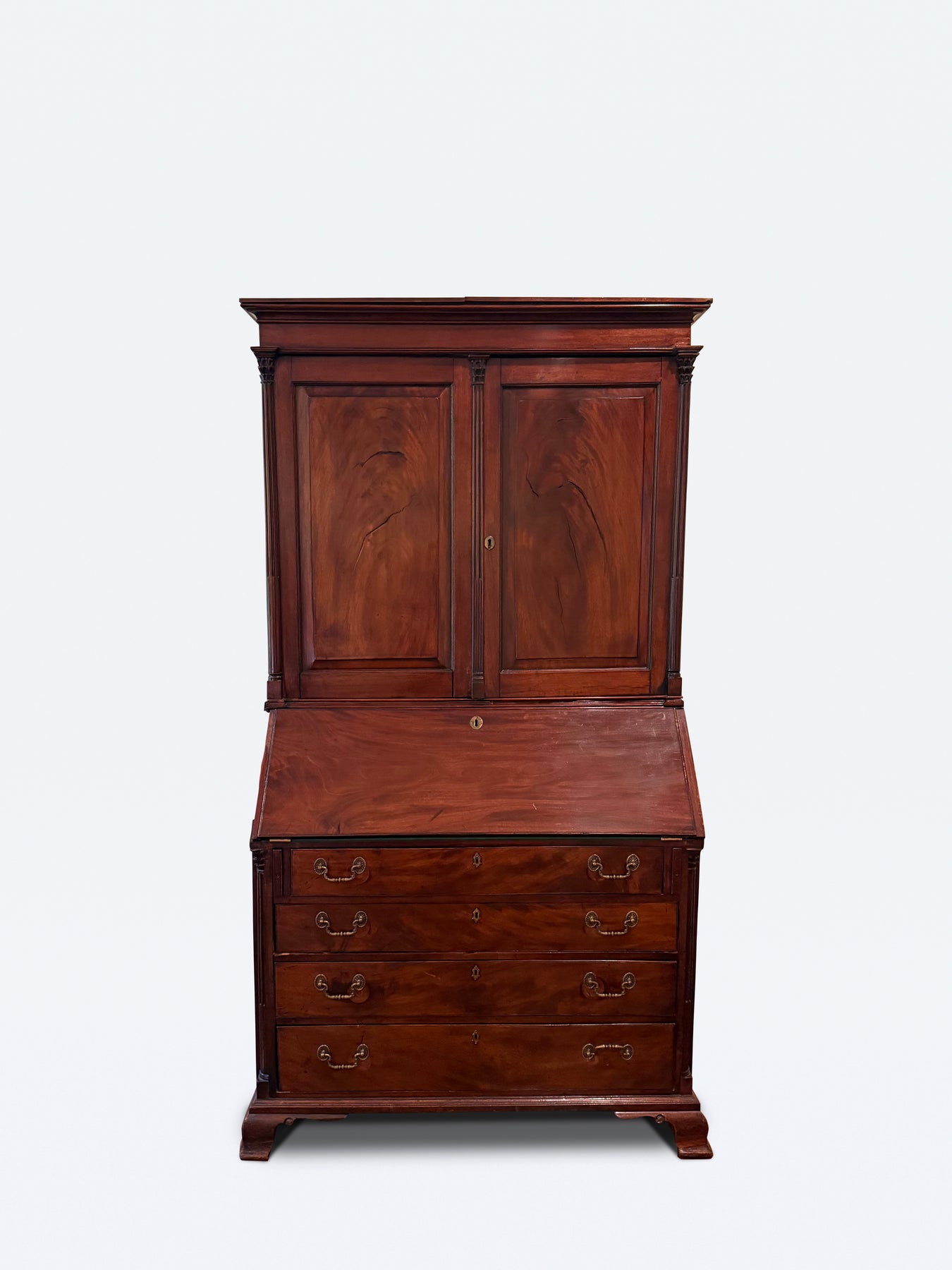 A handsome Antique Chippendale Mahogany slant front desk with secretary top. Both upper and lower cabinets having quarter columns which are duplicated in the interior. Bold ogee feet support lower case. Secretary top has doors fitted with solid panels.