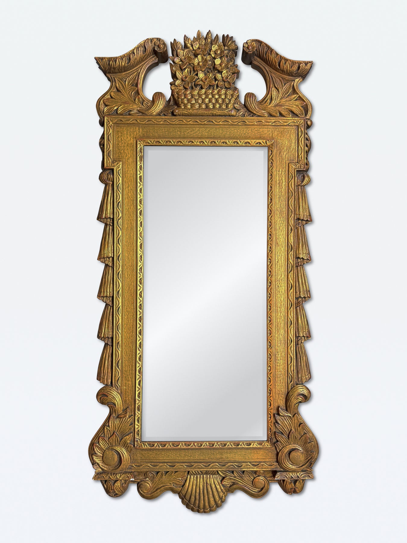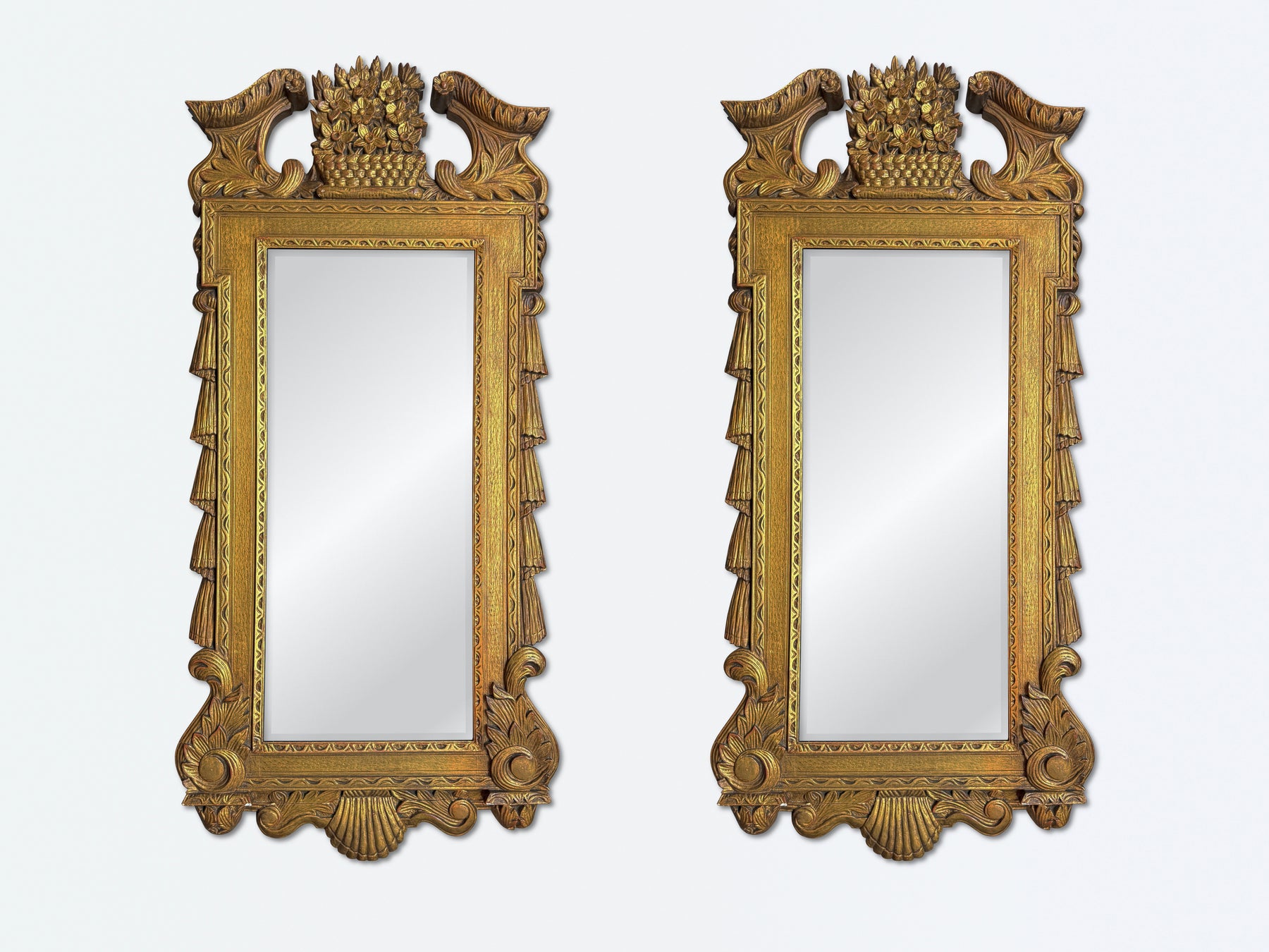 A lovely pair of French Giltwood Mirrors with floral pediments and frames bordered with a carved leafs and floral design moulding, defined by cascading swags. Mirrors were purchased in Paris by consignor's grandparents in the 1950's.