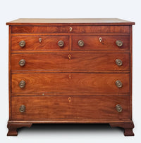 Chest of drawers with flat top, with crossbanded edge. Front composed of a narrow, full-length drawer with ivory teardrop escutcheon, over side-by-side drawers with similar escutcheon and two large, stamped brasses, over thres full-length drawers fitted in a similar manner. Molded base on ogee bracket feet.