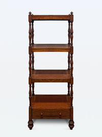 A mahogany four-tier whatnot, crafted in the Georgian style. The piece features four graduated tiers supported by turned baluster columns, topped with finials, and finished with a useful single drawer at the base.