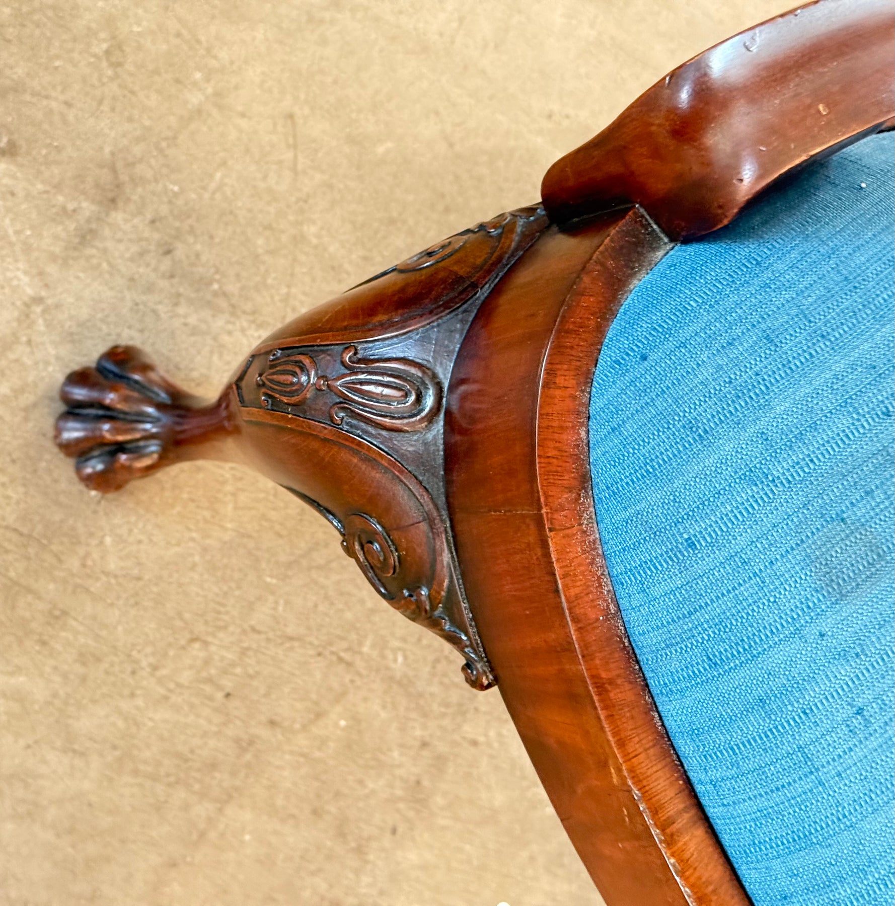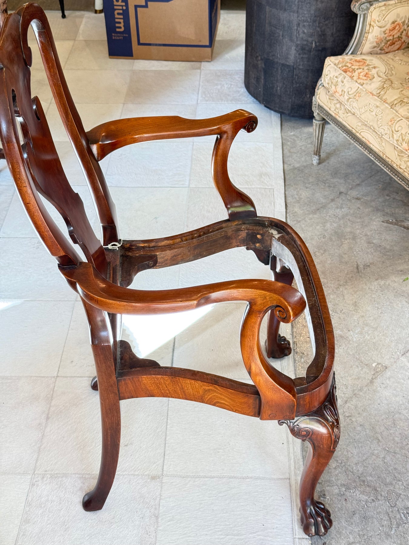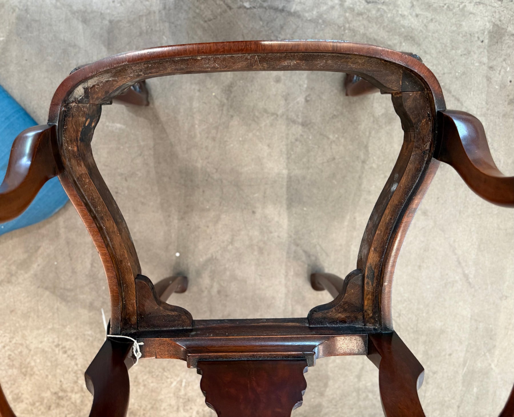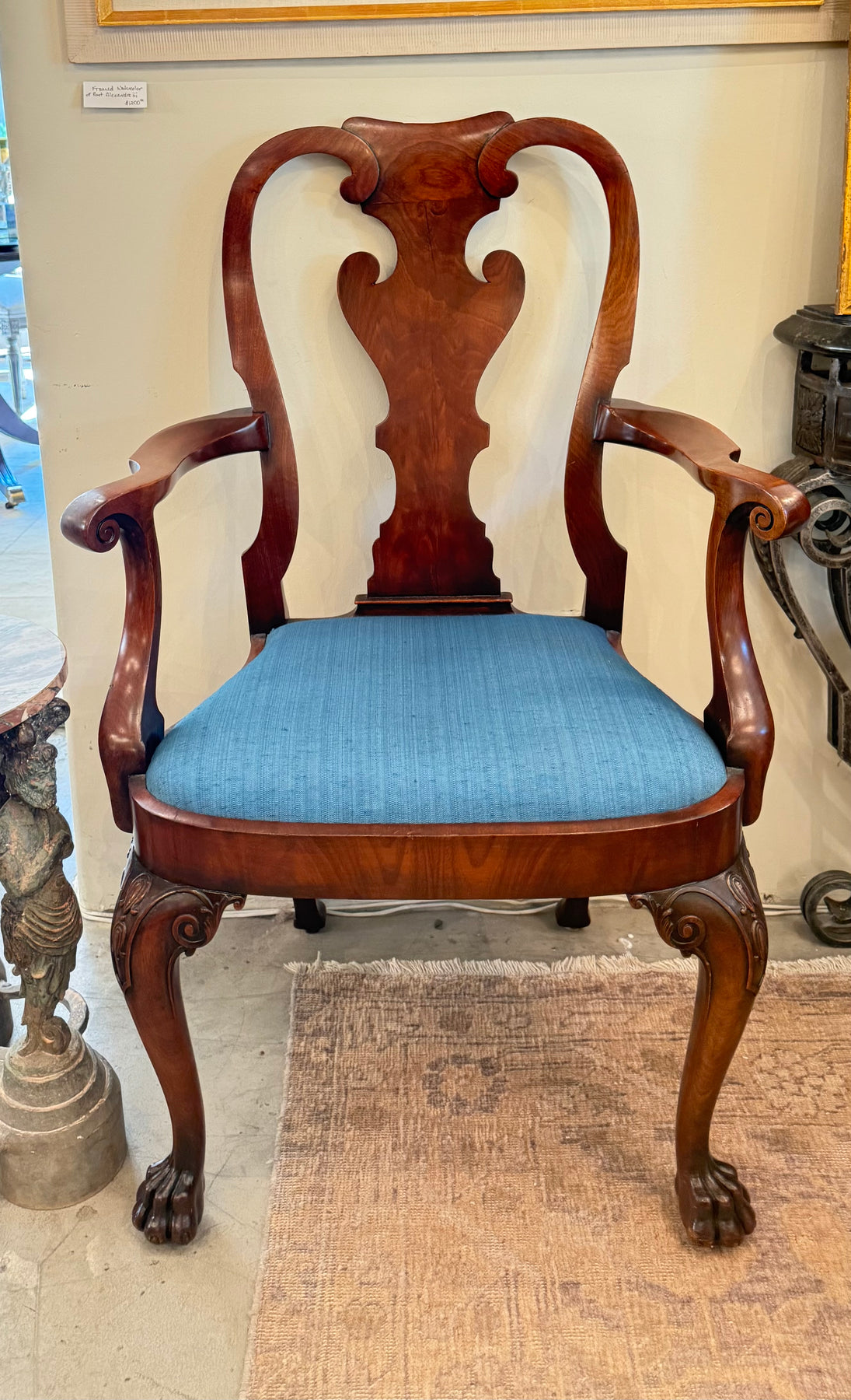 A Pair of Queen Anne style mahogany armchairs with yoke crest rail above flaring stiles and board, eared vased-shaped splats. Shaped arms scrolled at front. Rounded slip seat frame with molded edge; cabriole front legs with carved knees, terminating in paw feet.