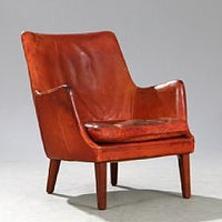 Arne Vodder lounge chair in original red patinated leather. Legs of teak. Made by K. Ivan Schechter of Copenhagen, Denmark. With metal plate from cabinetmaker.