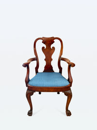 A Pair of Queen Anne style mahogany armchairs with yoke crest rail above flaring stiles and board, eared vased-shaped splats. Shaped arms scrolled at front. Rounded slip seat frame with molded edge; cabriole front legs with carved knees, terminating in paw feet.