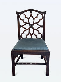 Antique English mahogany Chippendale side chair with gently flared stiles rising to a carved, serpentine crest rail and pierced back splat centered on a carved rosette raised on square section legs, chamfered on the inner corners.