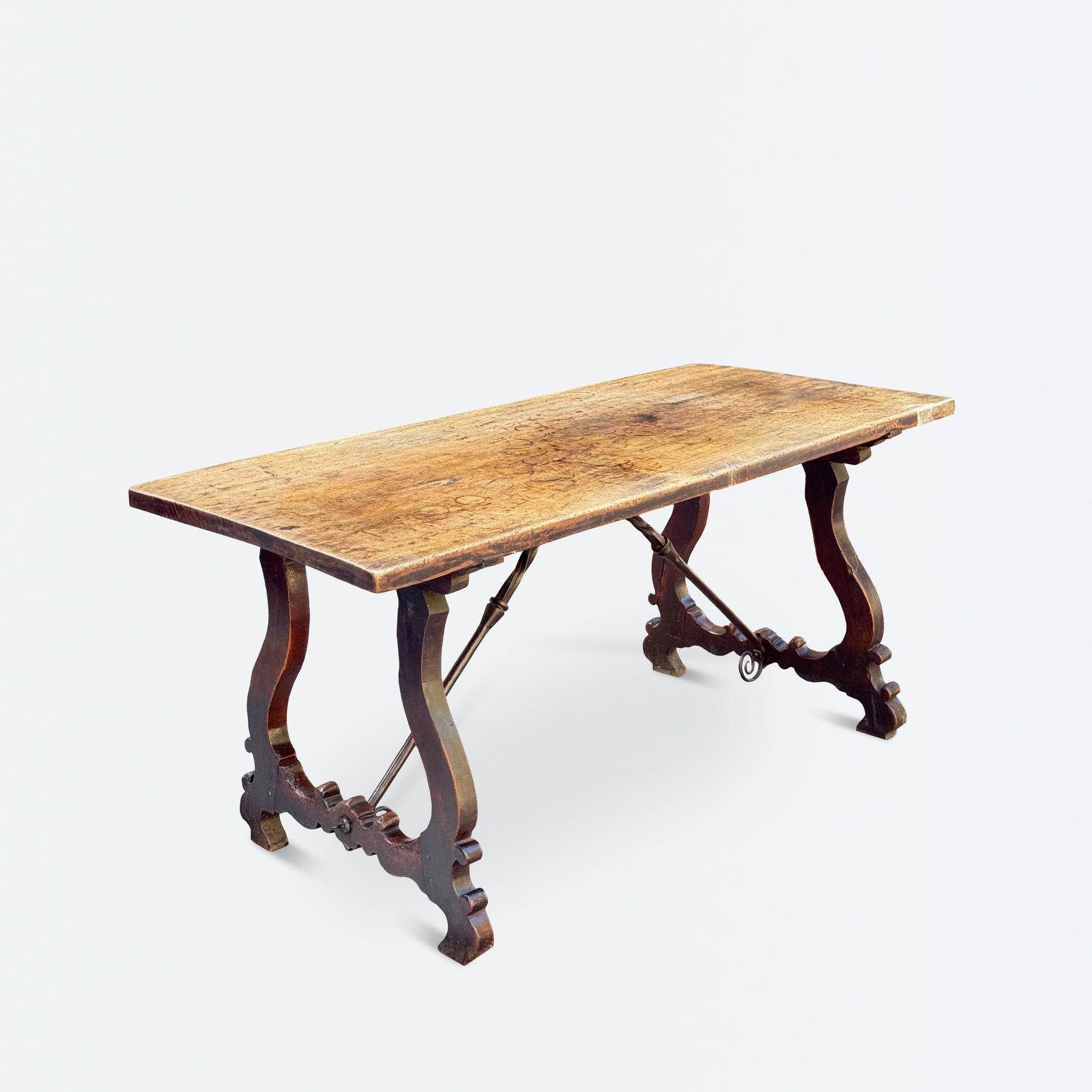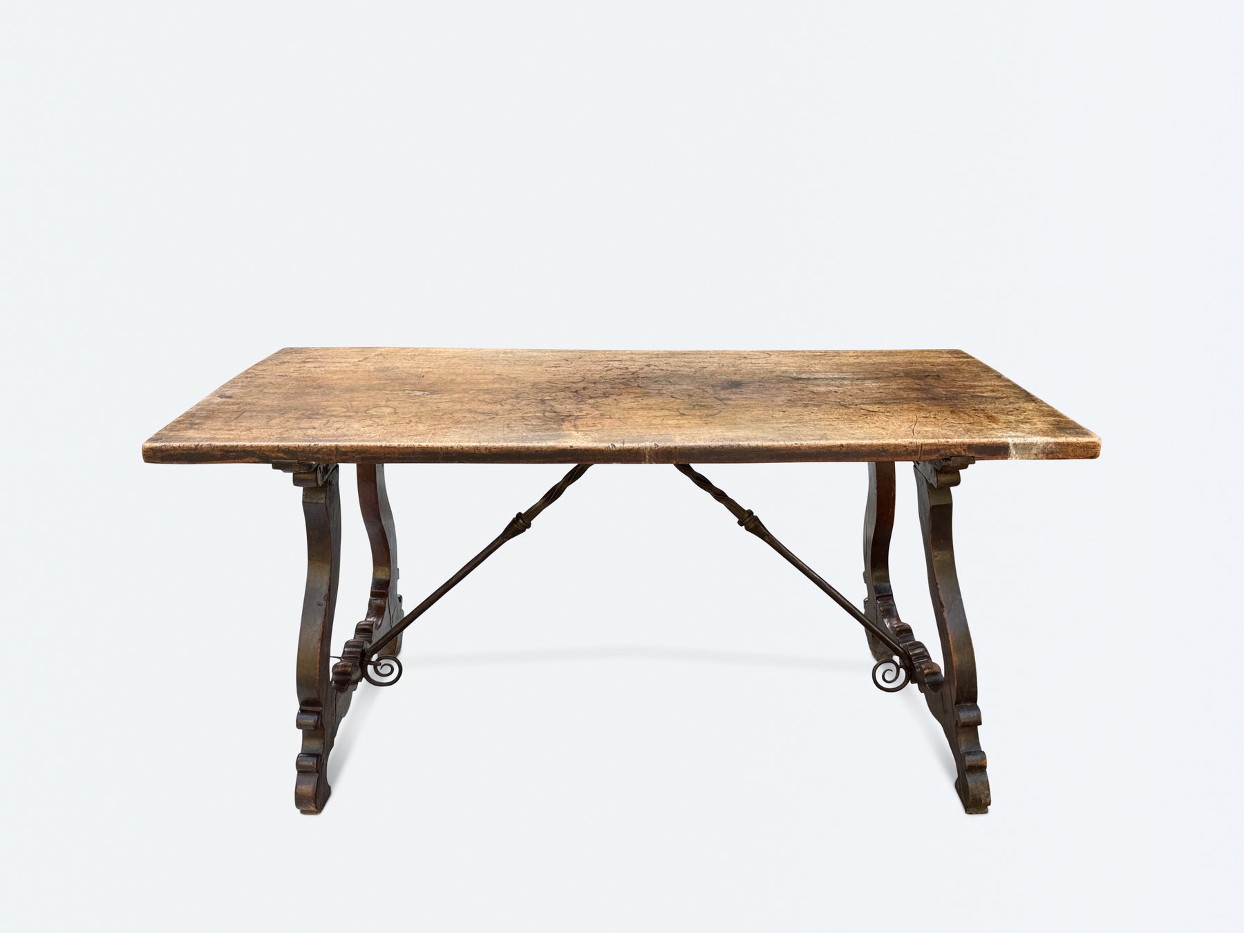Wonderfully handsome walnut with lyre sides and hand forged iron stretchers.