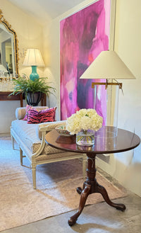 Antique round tilt top tea table on ring turned and urn pedestal, supported on three plain cabriole legs on pad feet.
