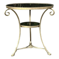 A handsome Directoire style Gueridon Side Table by Global Views featuring a graceful curved brass frame. This accent table showcases a round black granite top and matching lower tier, offering both sophistication and functionality. Its ornate scrolled legs and paw feet echo timeless style.