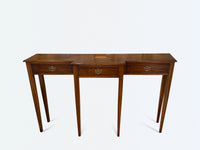 A handsome mahogany console with 3 drawers and satinwood banding. Perfect for a narrow space.