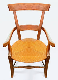 Antique French armchair with rush seat looks gracefully curved arms and back.