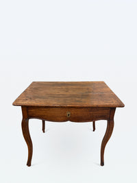 Beautiful antique Louis XV style fruitwood side table with plank top and single drawer.