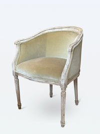 French-style Bergère chair, likely a Swedish Gustavian or Louis XVI style chair featuring a distressed white painted wood frame and velvet upholstery.
