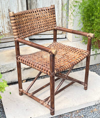 Vintage McGuire Antalya directors style dining armchairs featuring lattice style laced rawhide woven leather seats and back. the chairs are  crafted with rattan poles lashed together with leather rawhide laces on the exposed joints and arm ends. The generous seat is supported by straight legs conjoined by x form stretchers in a directors chair style. Made in the California organic modern style with McGuire makers plaque on bottoms.