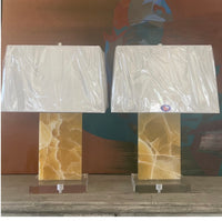 A handsome pair of yellow monolithic lamps made with cut stone from Utah on acrylic base and with linen shades.