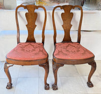 A set of 4 English Queen Anne Style Side Chairs with bowed crest rail and a shaped bowed vase shaped splat. Square molded seat rail supported on cabriole front legs with shell-carved knees with ball and claw feet.