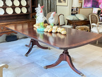 Vintage double pedestal mahogany dining table with pretty brass paw feet on casters and reeded edge.