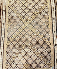 A vintage flat-woven Persian Kilim runner with an allover geometric design with a color palette of rich brown, pale yellow, and ivory.