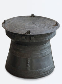 A vintage Asian cast bronze rain drum with circular top with four projecting frogs at the edge and concentric circle designs radiating from a central star.